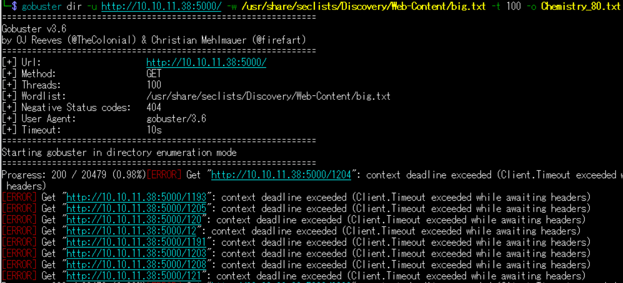 Progress: 200 / 20479 (0.98%)[ERROR] Get "http://10.10.11.38:5000/1204": context deadline exceeded (Client.Timeout exceeded while awaiting headers)
