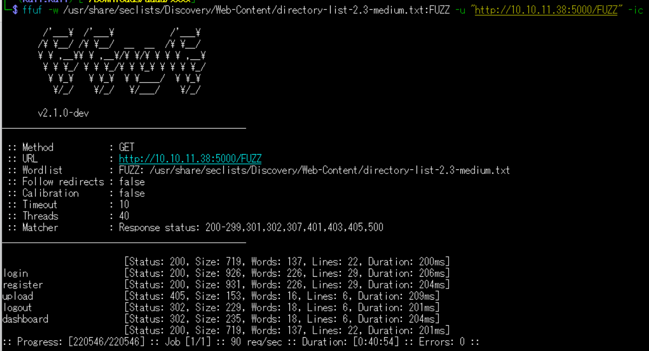$ ffuf -w /usr/share/seclists/Discovery/Web-Content/directory-list-2.3-medium.txt:FUZZ -u "http://10.10.11.38:5000/FUZZ" -ic
