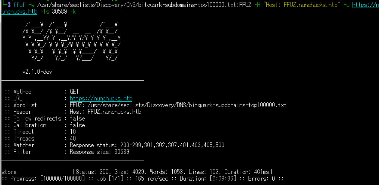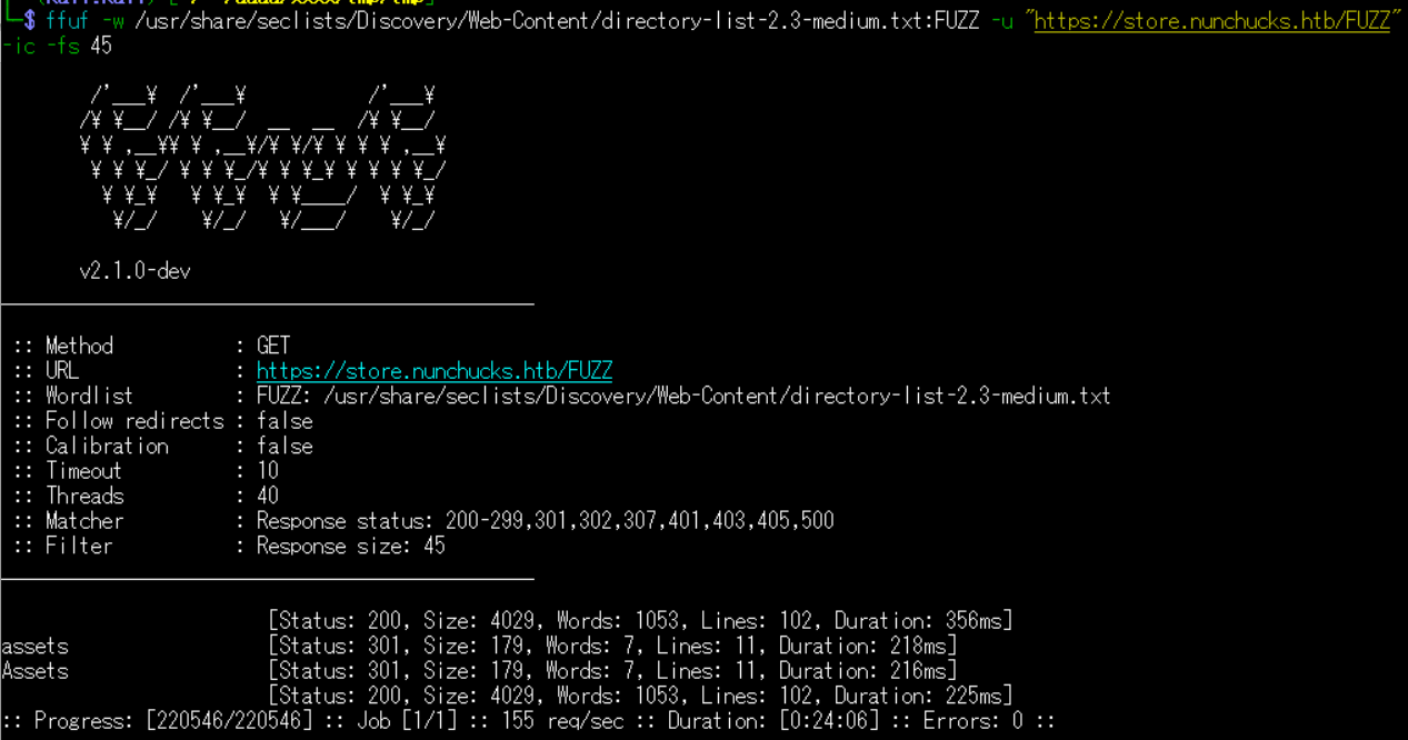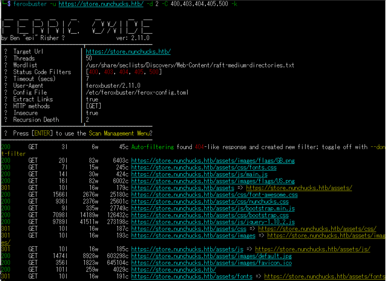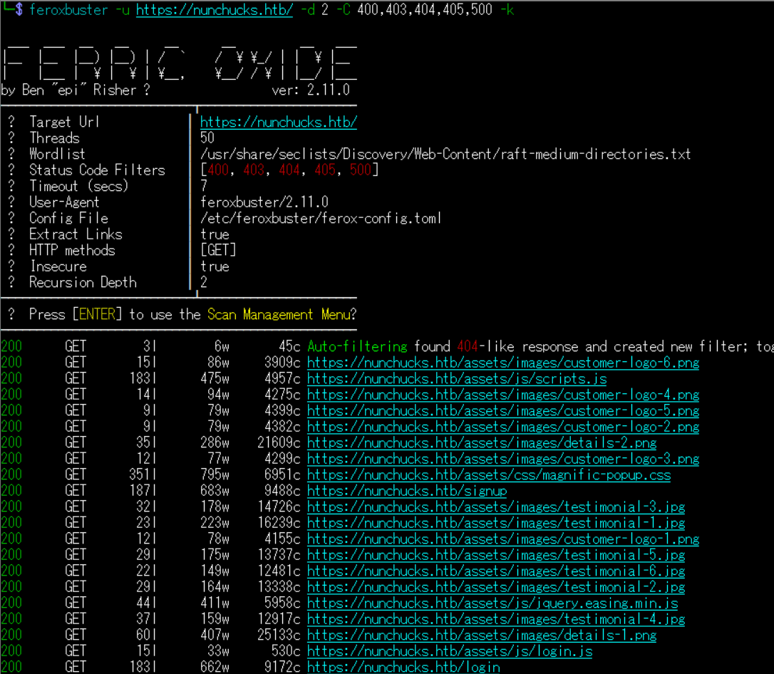 $ feroxbuster -u https://nunchucks.htb/ -d 2 -C 400,403,404,405,500 -k