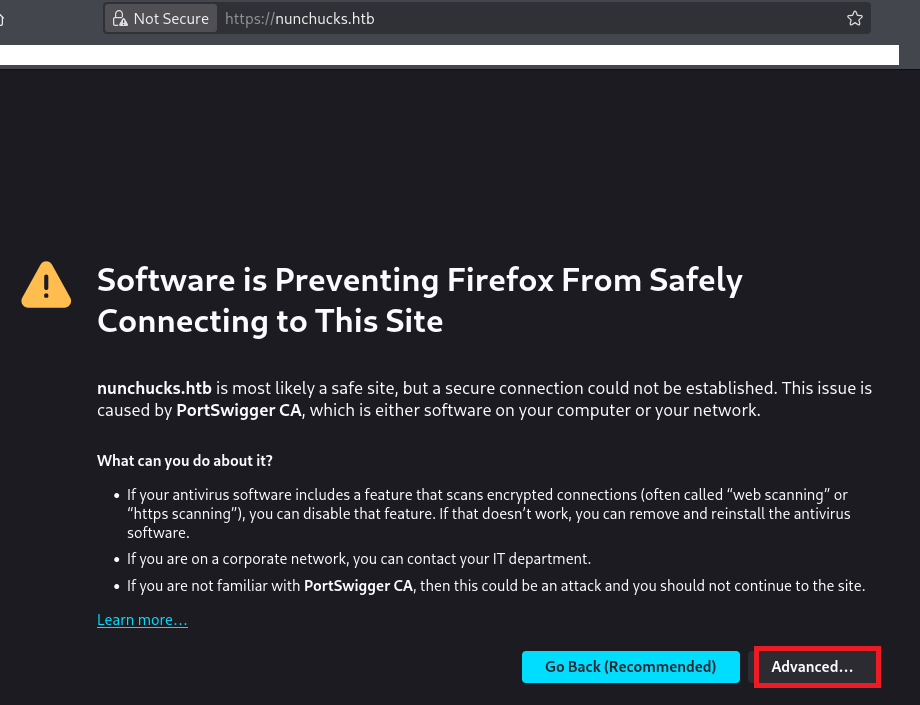 (3) ブラウザを用いて「https://nunchucks.htb/」にアクセスすると、信頼されていないSSL証明書を使用している旨の画面が表示される。その後、「Advanced…」をクリックする。
