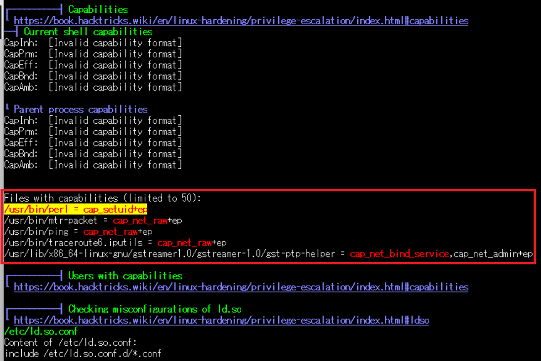 (4) linpeas.shの実行結果を確認すると、「/usr/bin/perl = cap_setuid+ep」があるためperlにLinux CAP_SETUID機能が設定されていることが分かる。