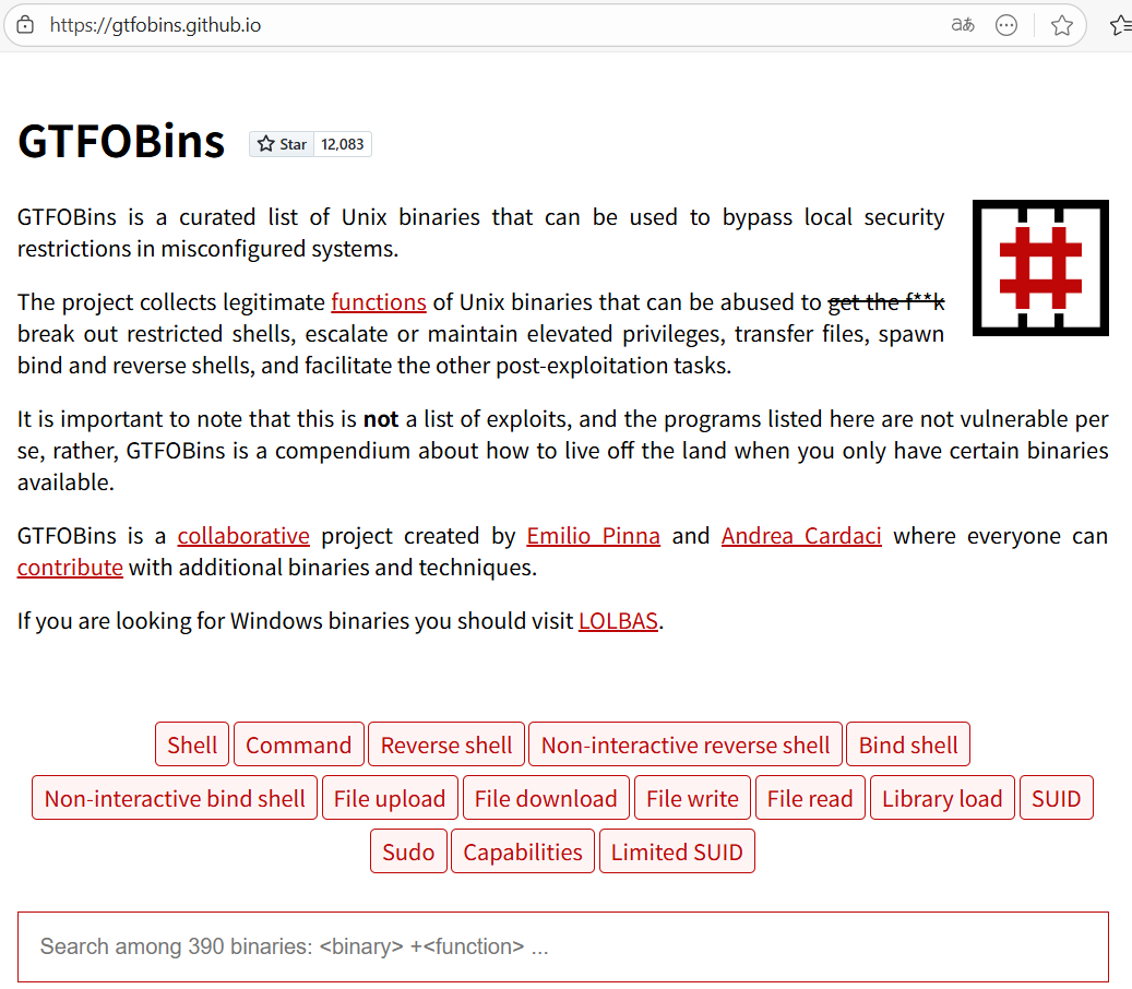 (2) ブラウザを用いてGTFOBins(https://gtfobins.github.io/)にアクセスする。