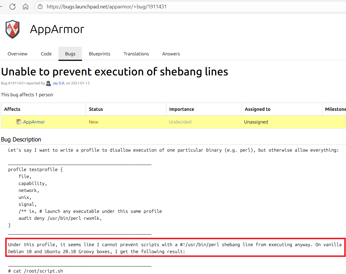 「https://bugs.launchpad.net/apparmor/+bug/1911431」にスクリプトファイルに「#!/usr/bin/perl」を記載して実行権限を付与したファイルを実行することでAppArmorを回避できることが分かる。