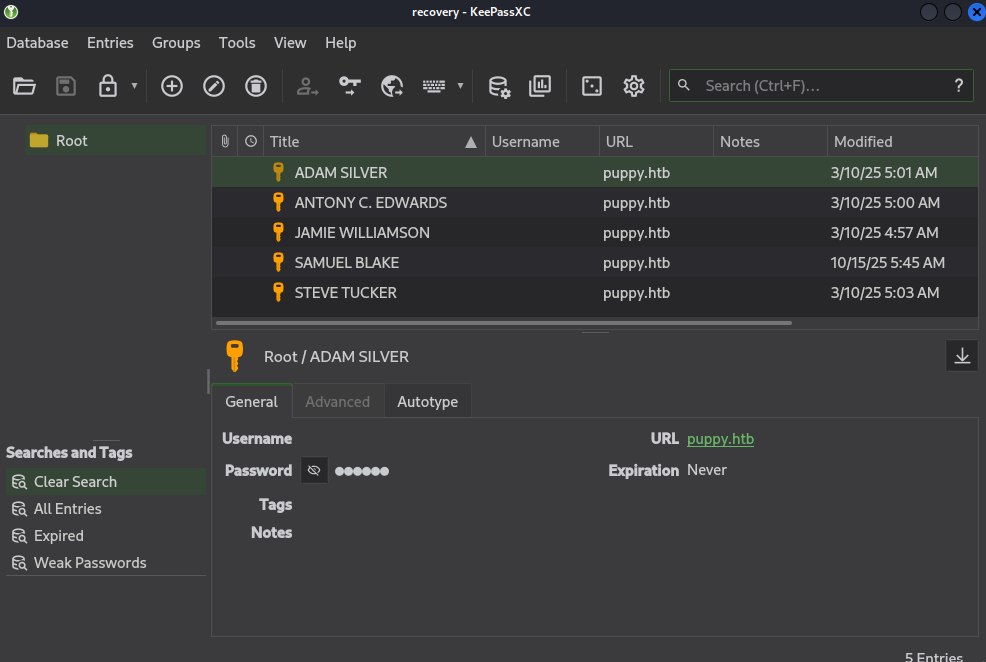 SMB         puppy.htb       445    DC               [-] Error enumerating shares: STATUS_USER_SESSION_DELETED