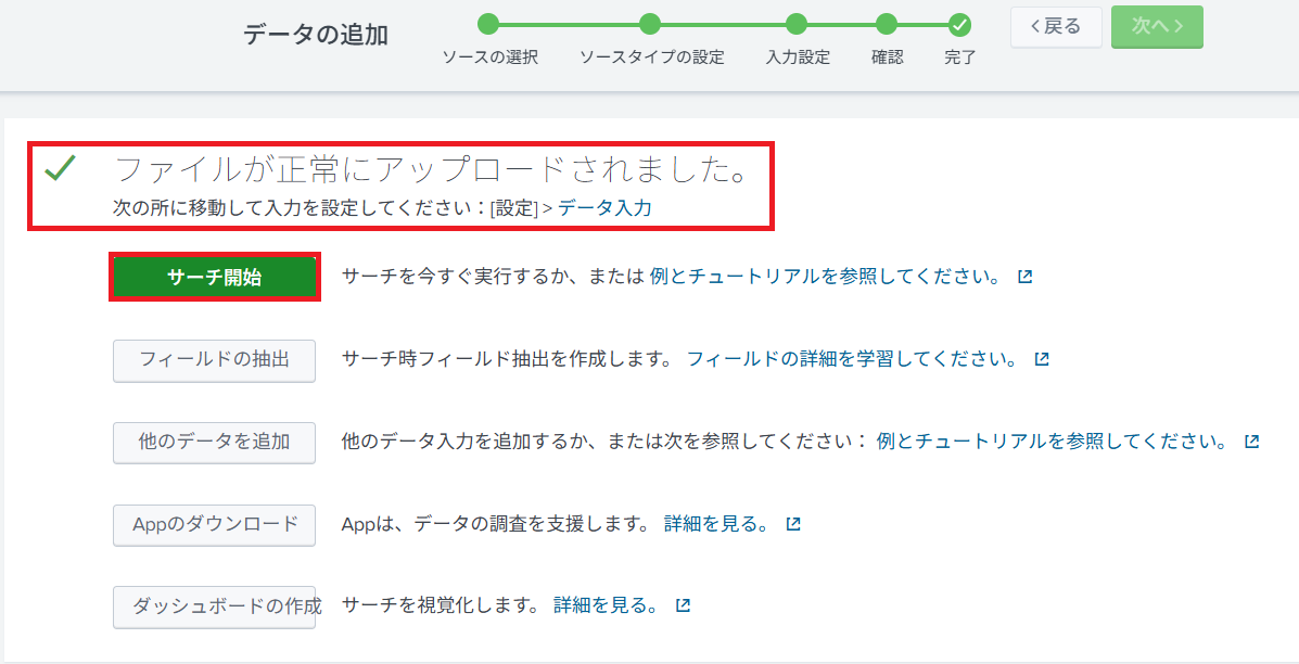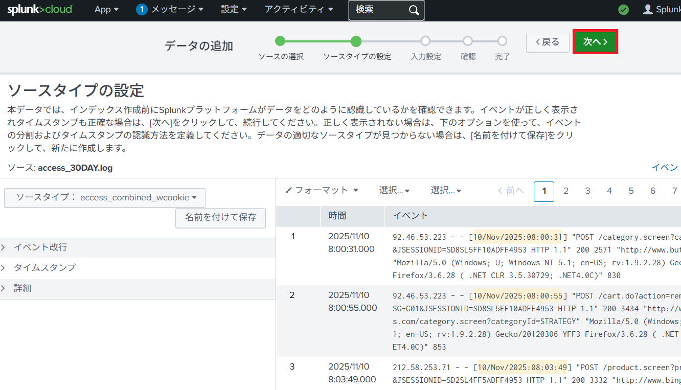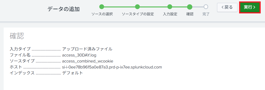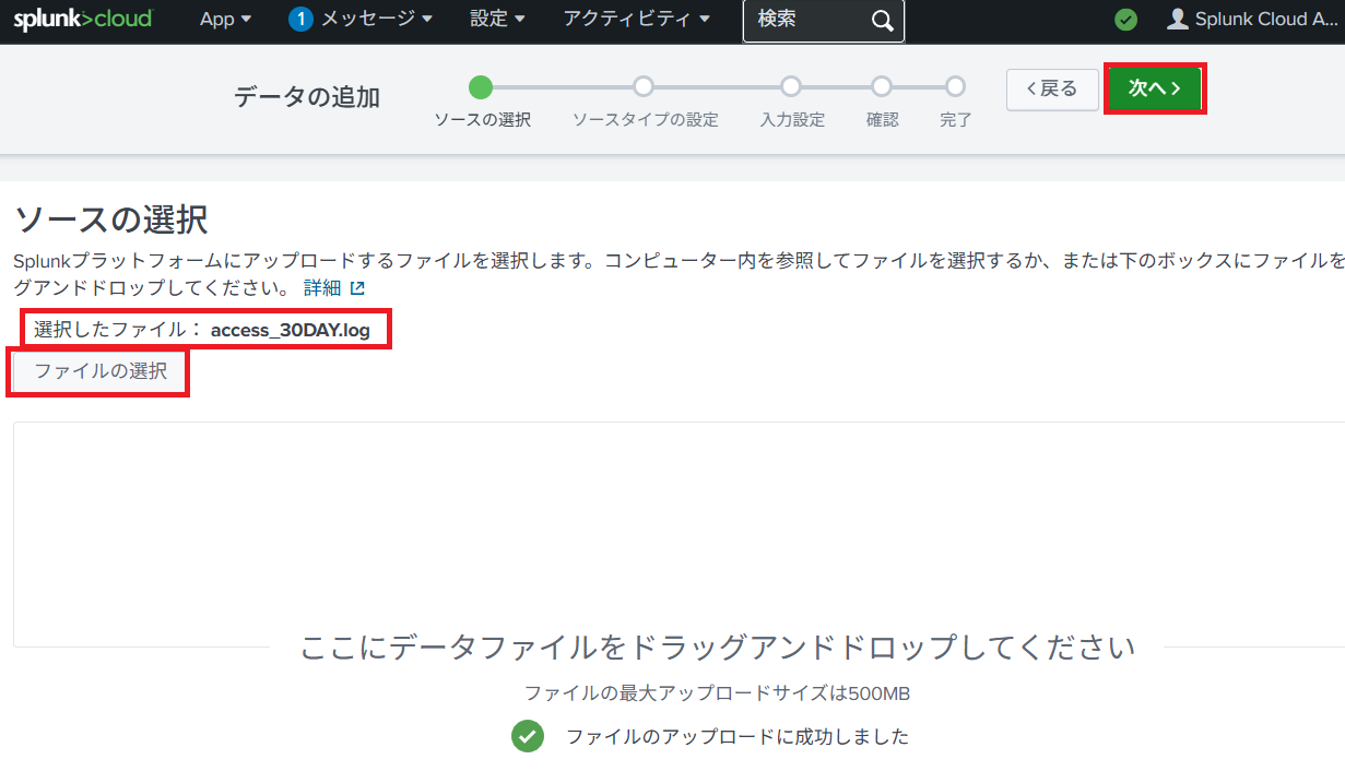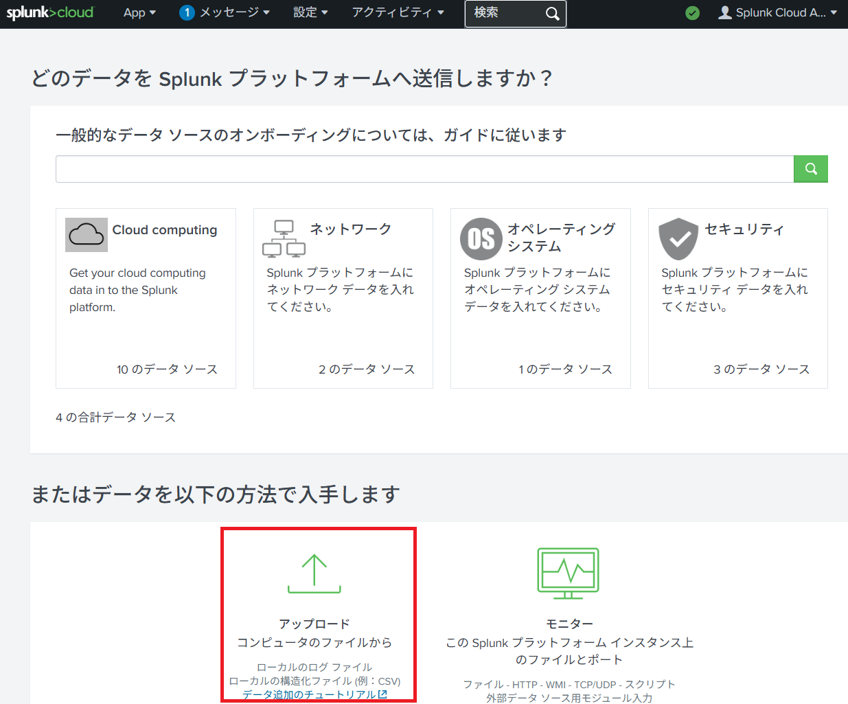 その後、テスト用のログデータをアップロードすることでSplunk Cloudにデータを取り込みます。