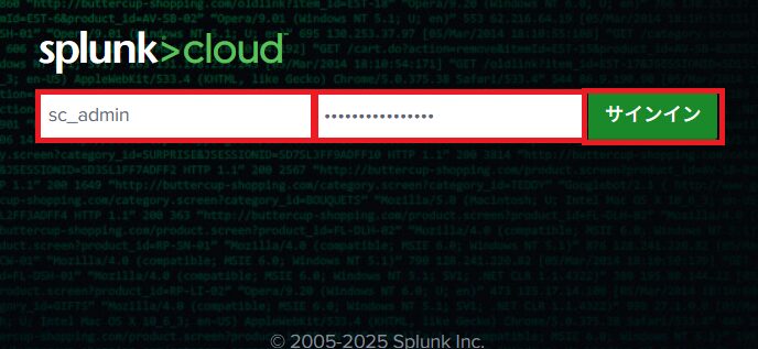 (8) メールに記載されたSplunk CloudのURLにアクセスし、ユーザー名とパスワードを入力する。その後、「サインイン」をクリックする。