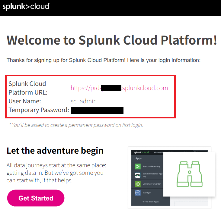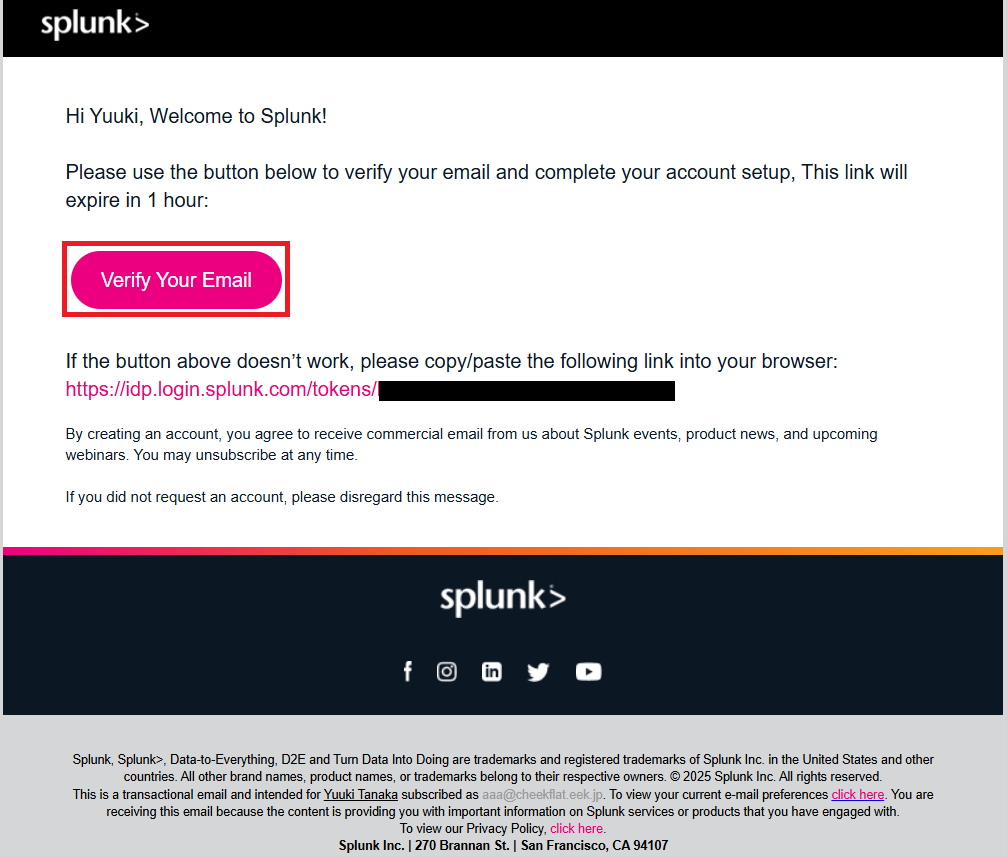(7) 入力したメールアドレス宛にメールが届いており、Splunk CloudのURL、ユーザー名、パスワードが記載されていることを確認する。