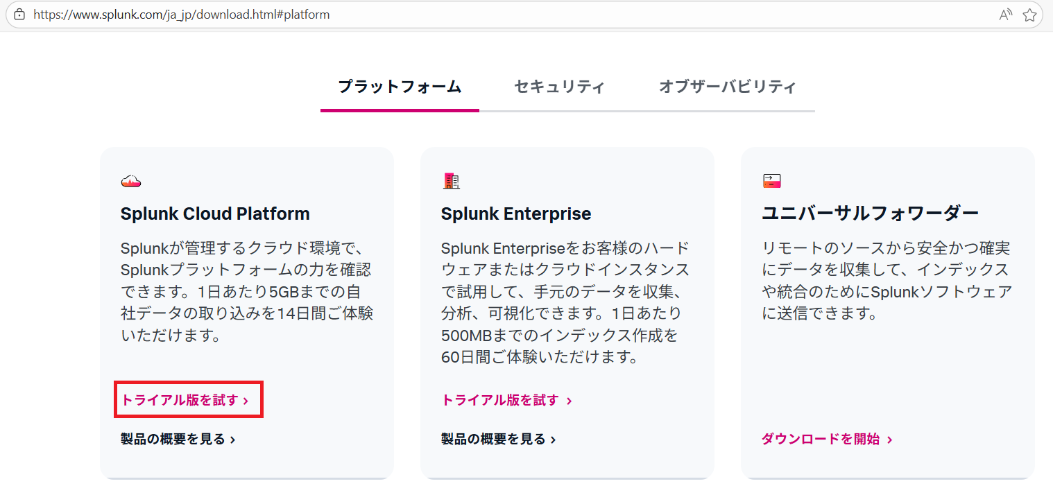 (1) ブラウザを用いて「https://www.splunk.com/ja_jp/download.html」にアクセスし、「Splunk Cloud Platform」をクリックする。