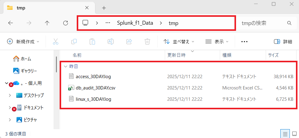 (2) 「Splunk_f1_Data.zip」を解凍しtmpフォルダの中にログファイルがあることを確認する。