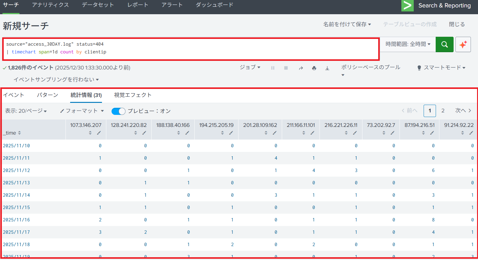 HTTPステータスコード404になっているIPアドレスのエラー回数を1日ごとに集計する。