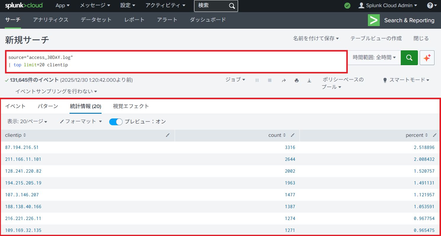| top | 出現頻度が最も多い値を表示する。 | top limit=数値 フィールド名 【使用例】 | top limit=20 clientip |