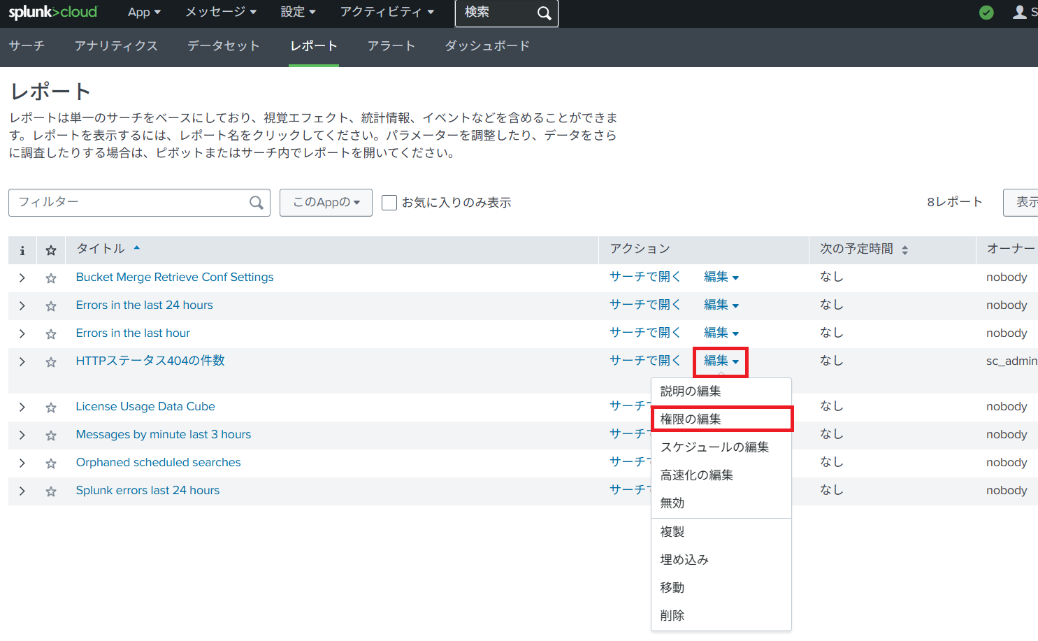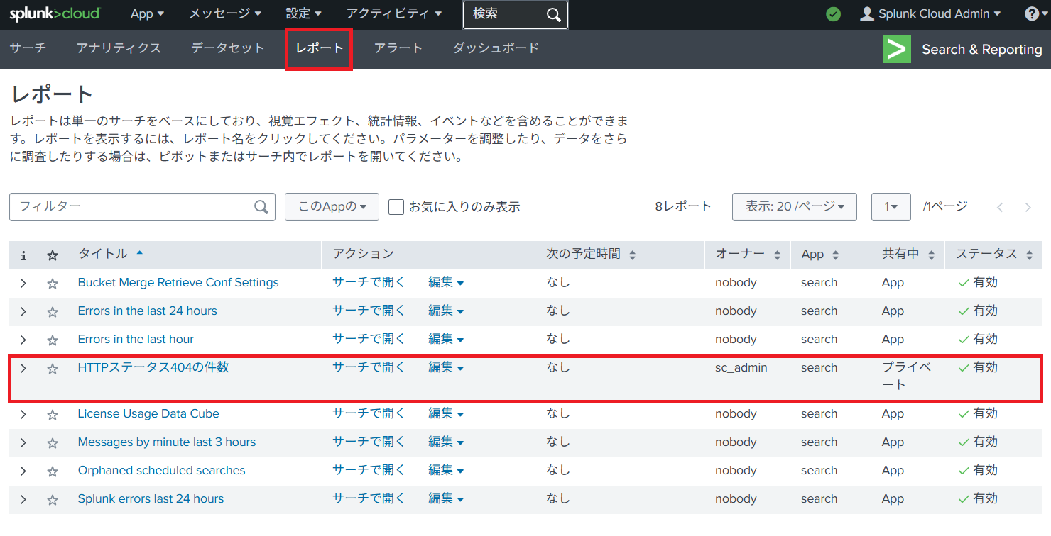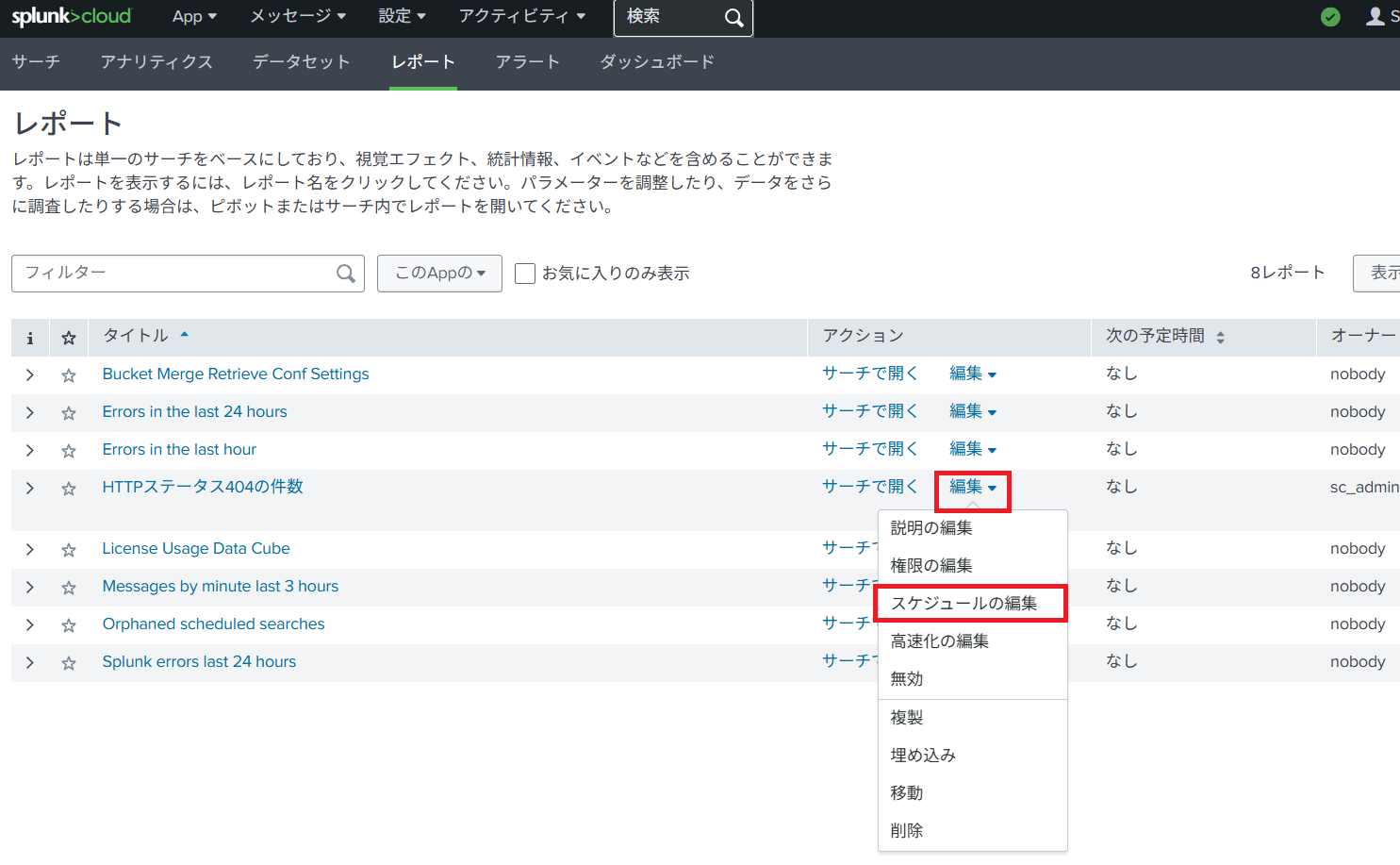本記事では、Splunk Cloudで定期的にレポート設定する手順を記載する。