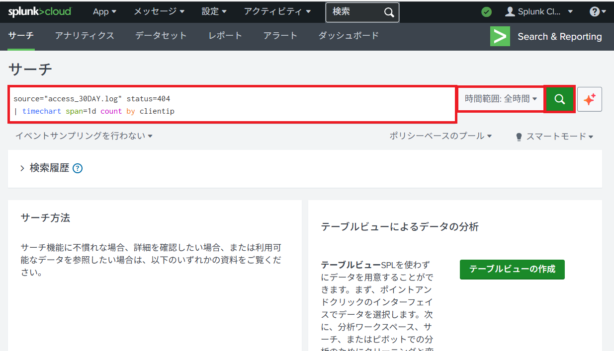 (2) テキストボックス欄に検索文字列(SPL)を入力する。その後、検索する期間を設定し、検索ボタンをクリックする。