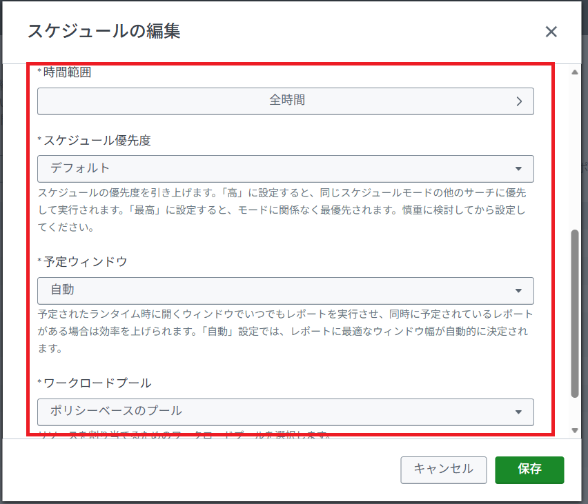 (11) 時間範囲、スケジュール優先度、予定ウィンドウ、ワークロードプールを設定する。