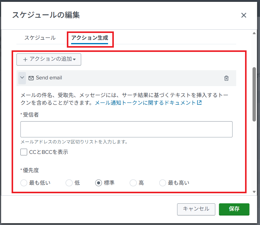 (12) 「アクションを生成」タブで「アクションの追加」をクリックし、「Send email」をクリックする。その後、レポートの受信者のメールアドレスなどを設定する。