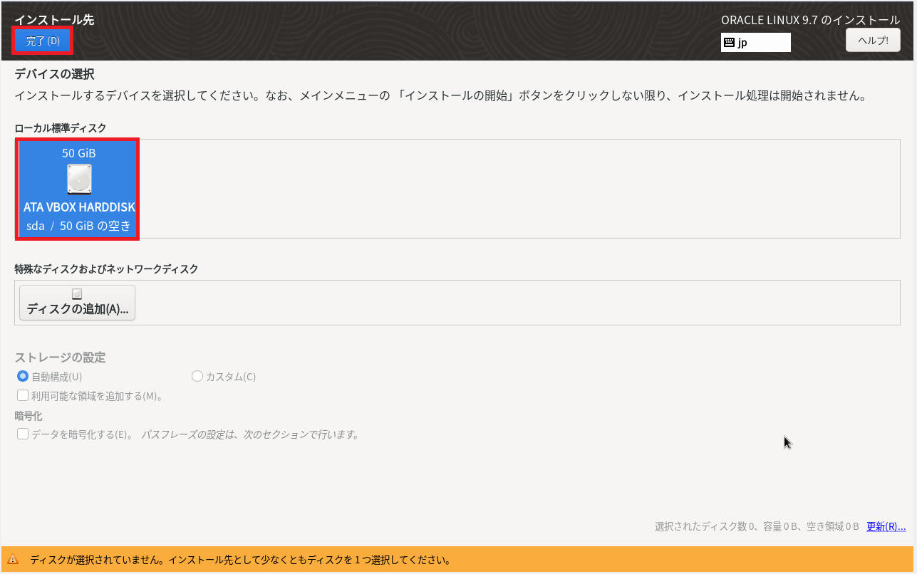 (10) 「ローカルの標準ディスク」を選択して、「完了」をクリックします。
