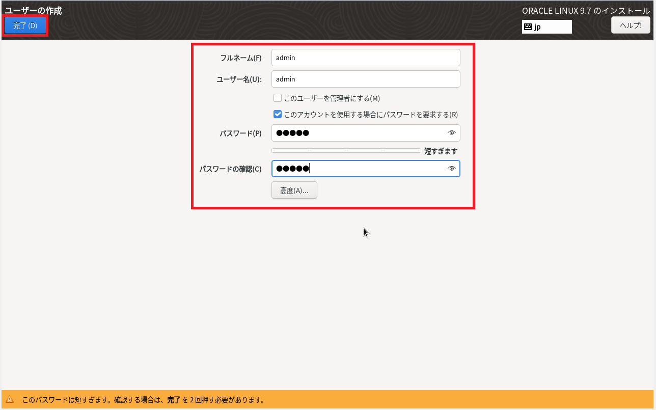(14) 作成するユーザーのユーザー名やパスワードなどを設定して、「完了」をクリックする。