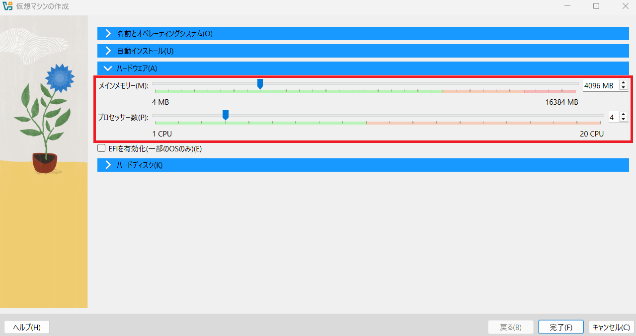 (4) 「ハードウェア」欄に、任意のメモリ及びCPUコア数を設定します。