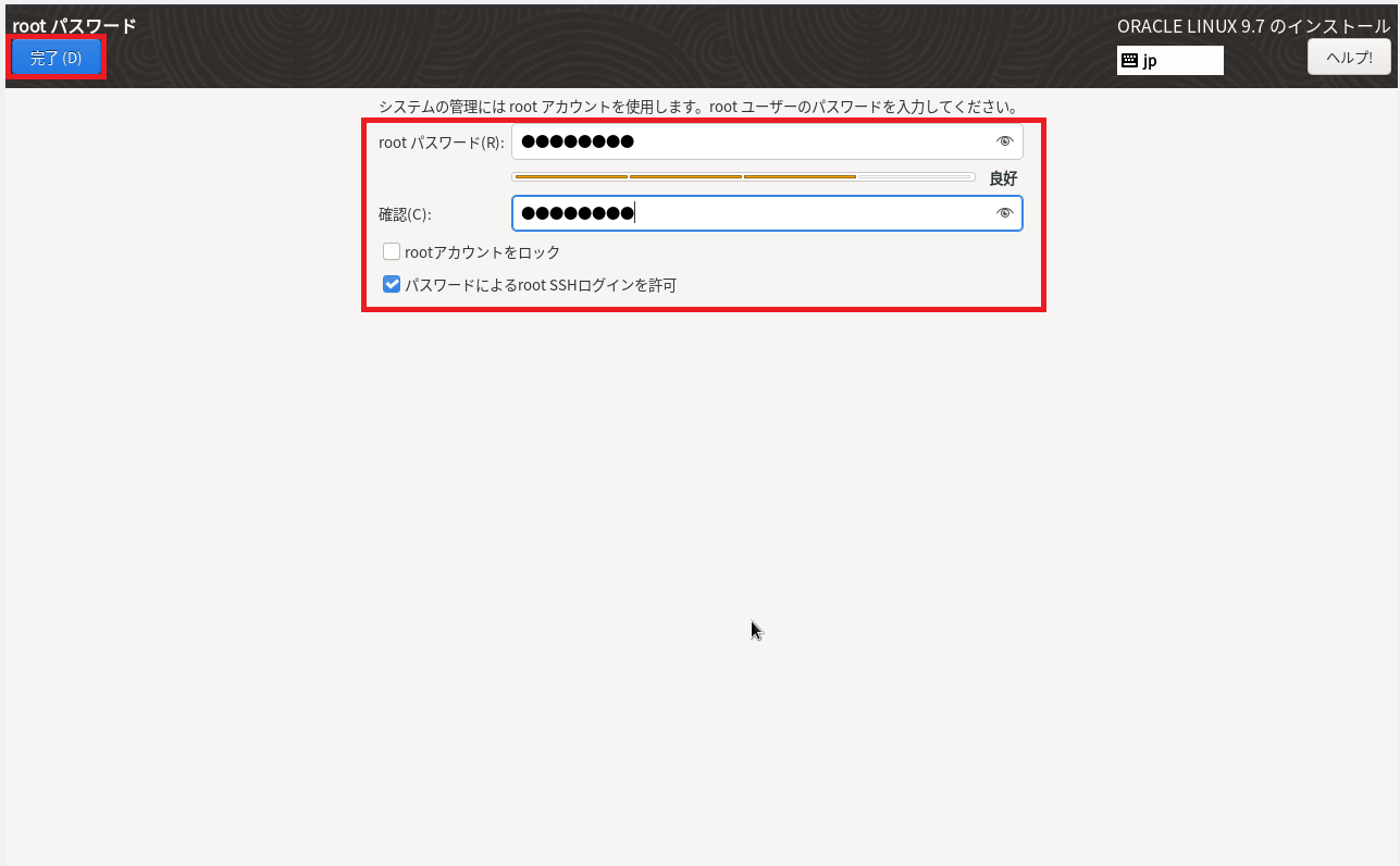 (12) rootユーザーのパスワードなどを設定して、「完了」をクリックする。