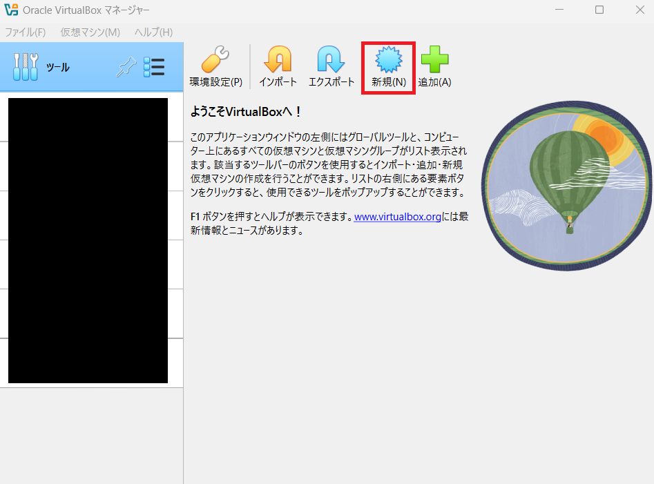 (2) Virtualboxを起動します。その後、「新規」をクリックします。