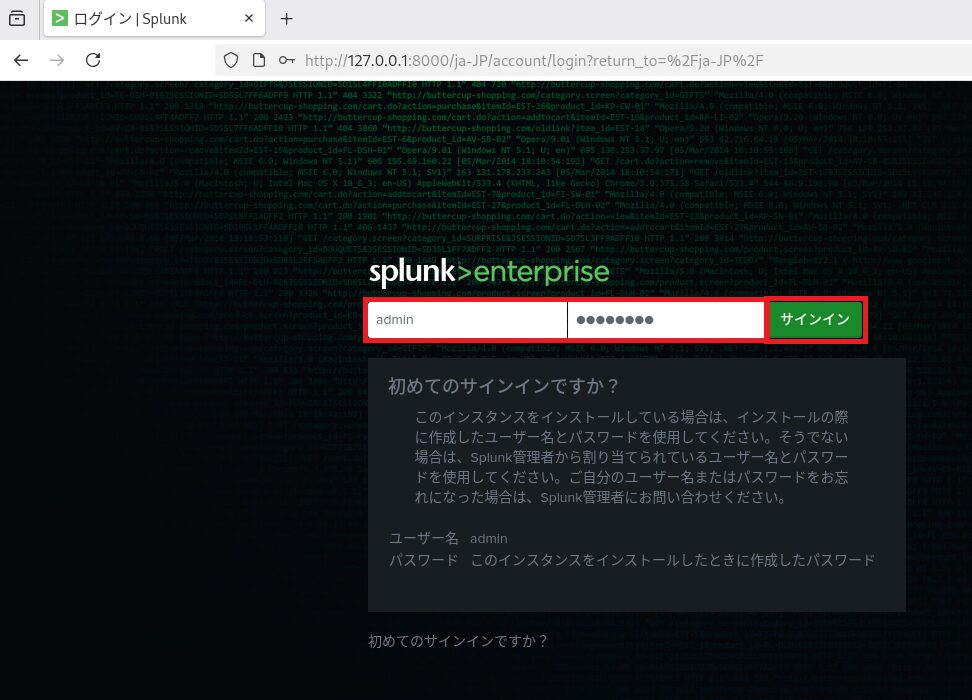 # /opt/splunk/bin/splunk enable boot-start Splunk Enterpriseの管理画面へのログイン