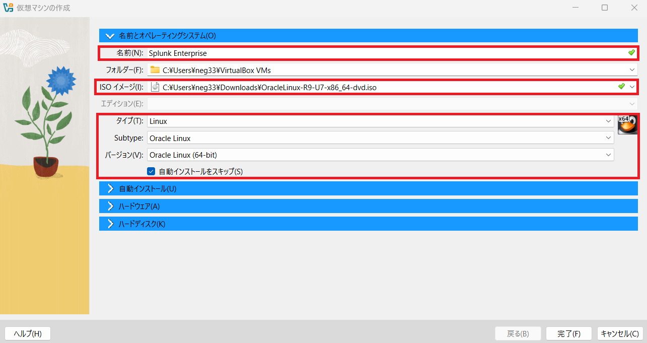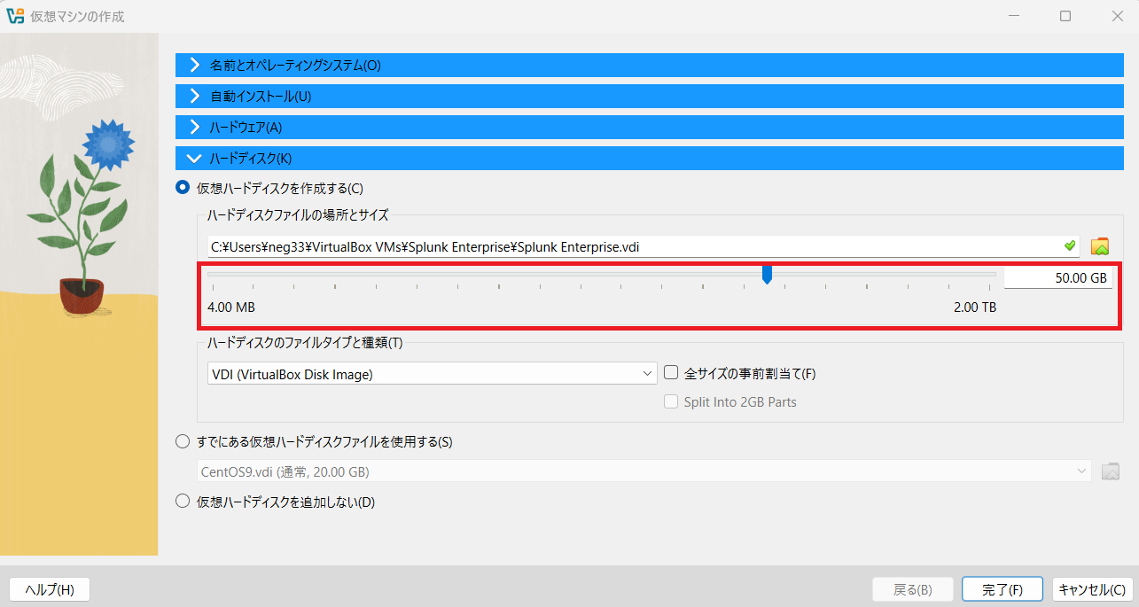 (5) 「ハードディスク」欄に、ディスク容量を設定する。その後、「完了」をクリックします。