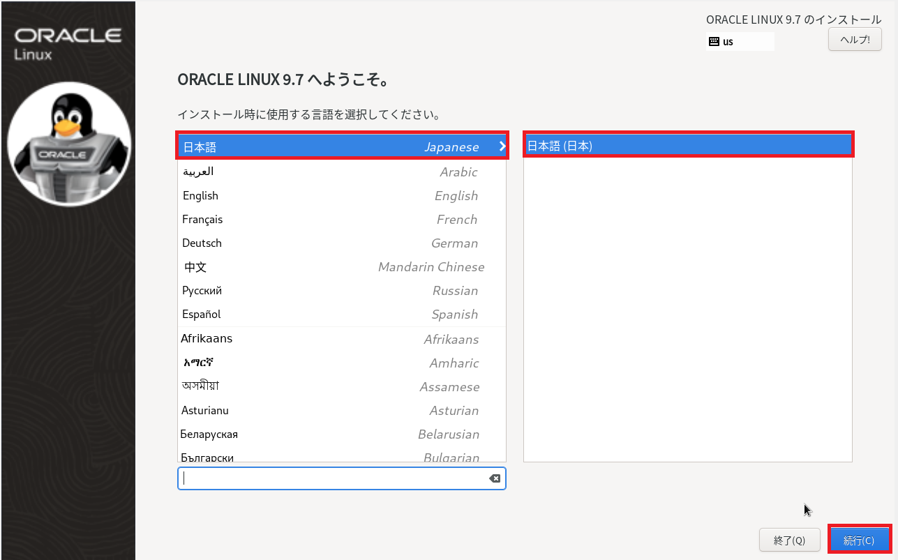 (8) 「日本語」-「日本語(日本)」を選択して、「続行」をクリックします。