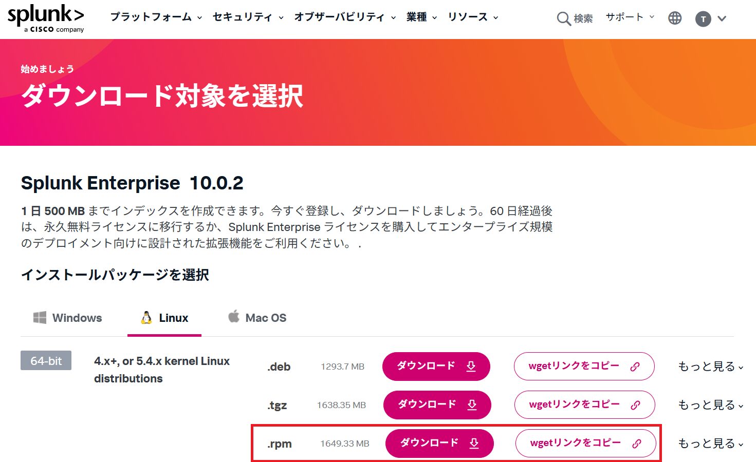 (8) Splunk EnterpriseのRPMファイルをダウンロードします。