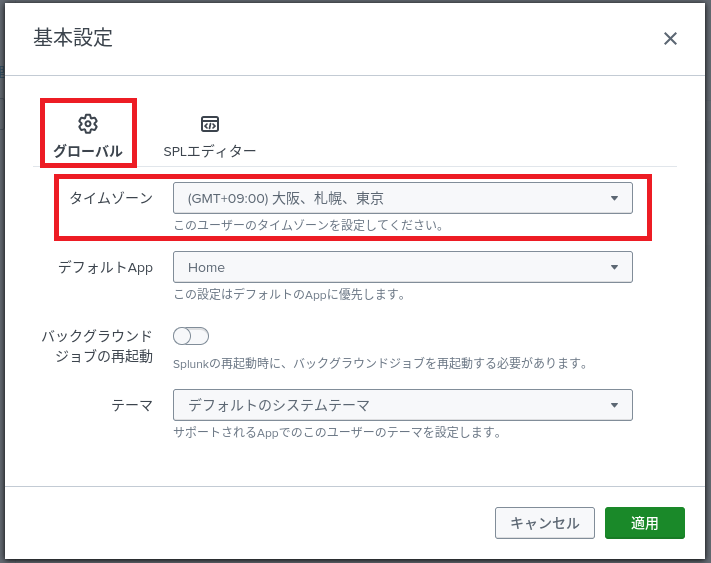 (2) 「グローバル」タブのタイムゾーンを設定する。