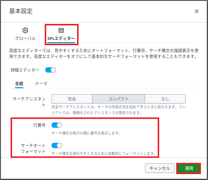 (3) 「SPLエディター」タブの行番号とサーチフォーマットをONにする。