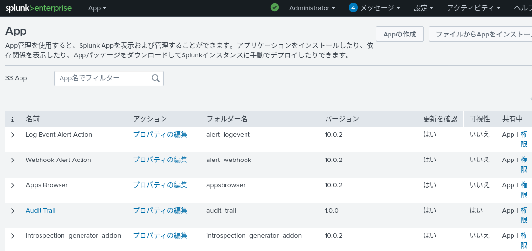 (2) Splunk EnterpriseのApp一覧が表示されていることを確認する。