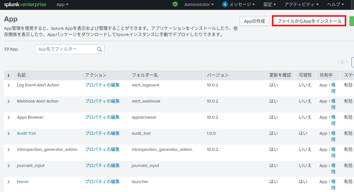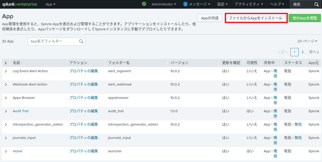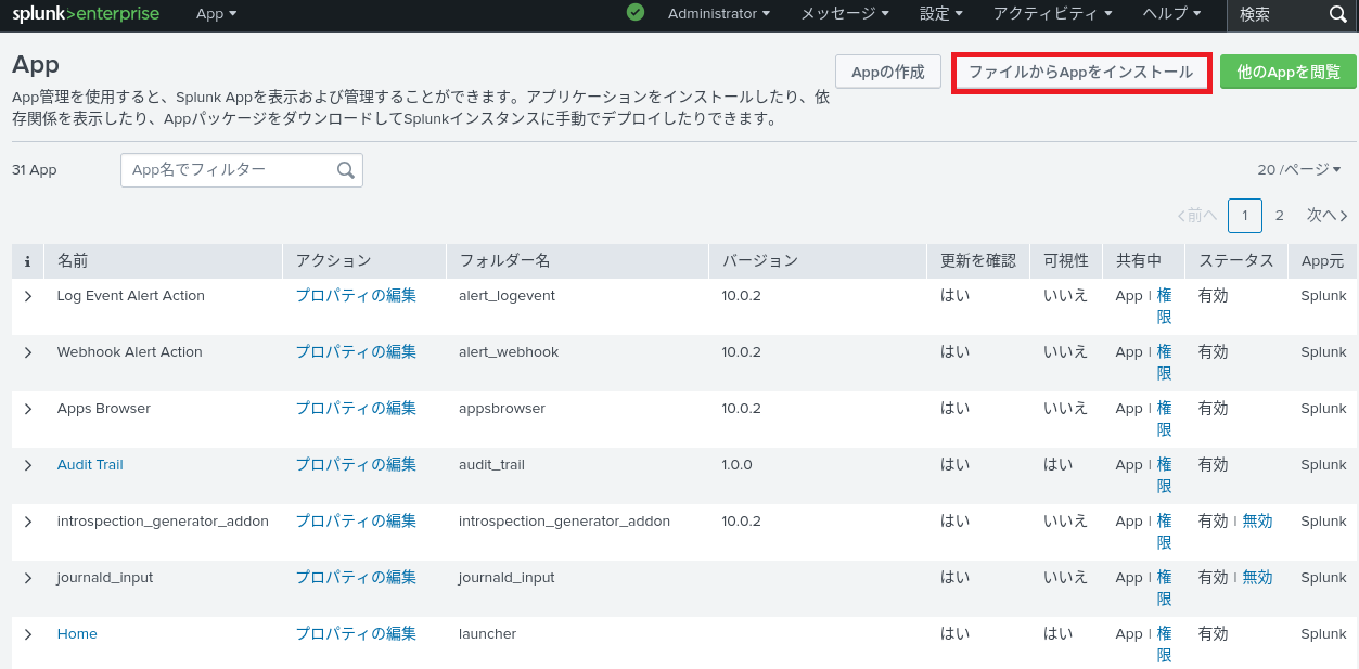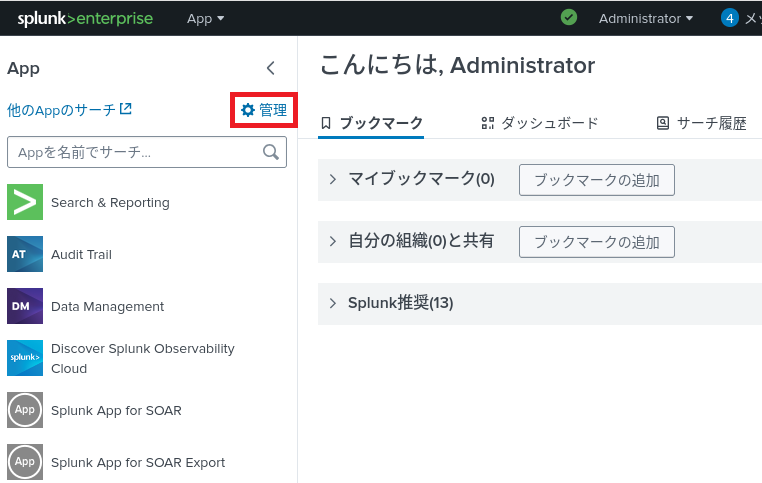 (2) ブラウザを用いてSplunk Enterpriseの管理画面(http://[Splunk EnterpriseのIPアドレス]:8000/)にログインし、App画面の「管理」をクリックする。