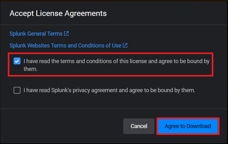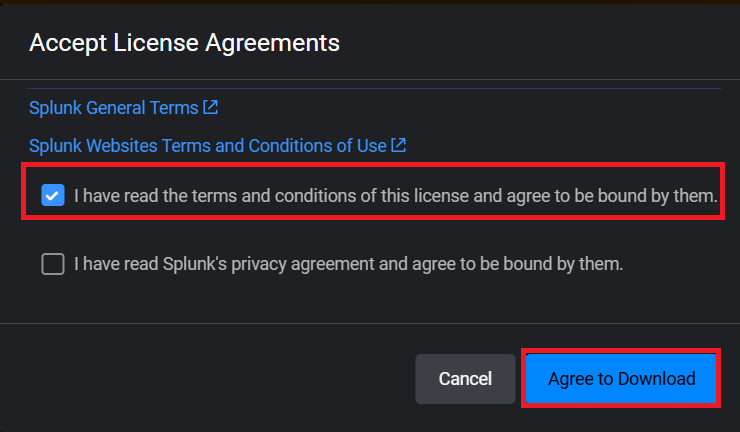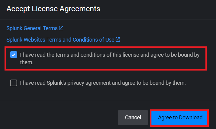 (8) ライセンスの条件に同意するにチェックを付けて、「Agree to Download」をクリックする。ファイル(splunk-app-for-soar_1072.tgz)をダウンロードされる。