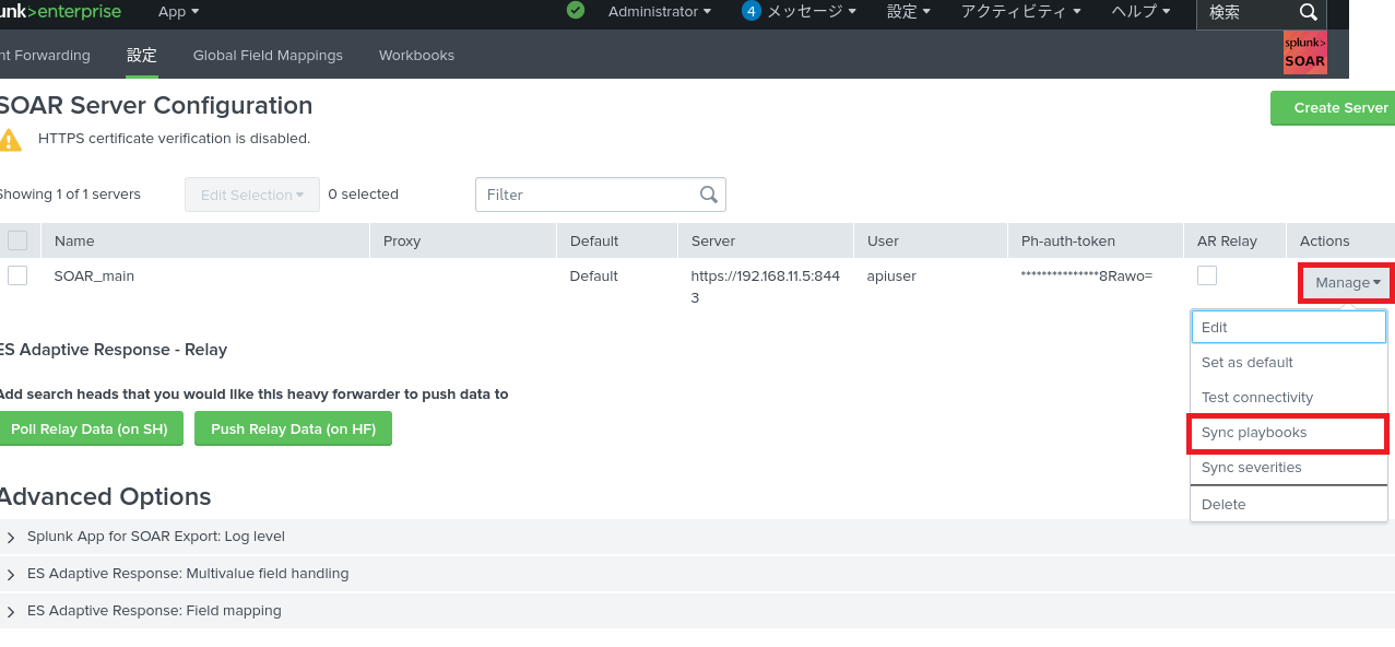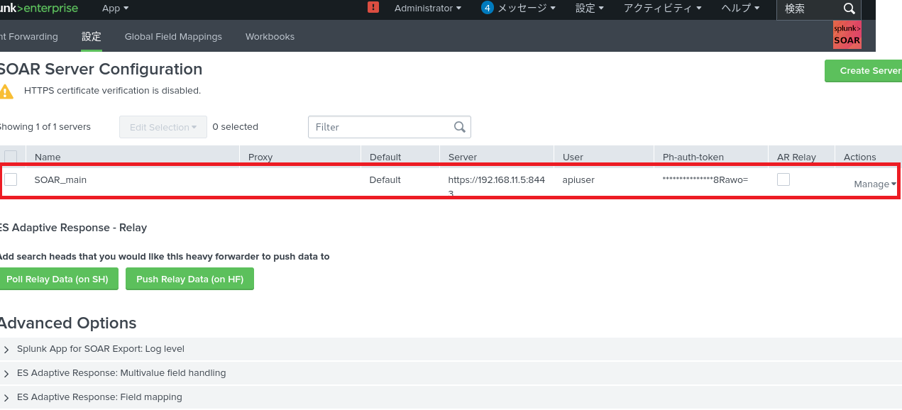 ※上記の「SOAR_main」は「Splunk App for SOAR Export」で設定したサーバー名のため、必要に応じて変更してください。