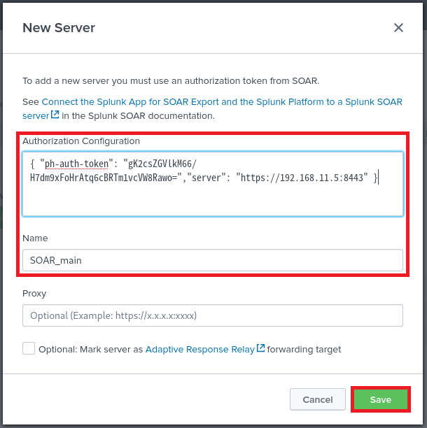 (5) 「Splunk App for SOAR Export」の画面にコピーしたREST APIのトークン文字列を張り付ける。その後、任意のサーバー名(例:SOAR_main)を入力して、保存をクリックする。