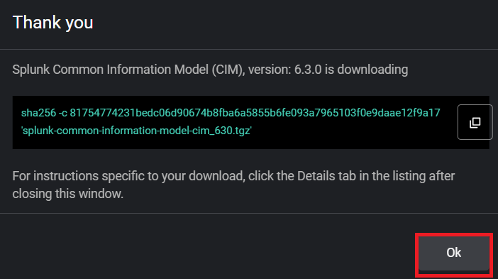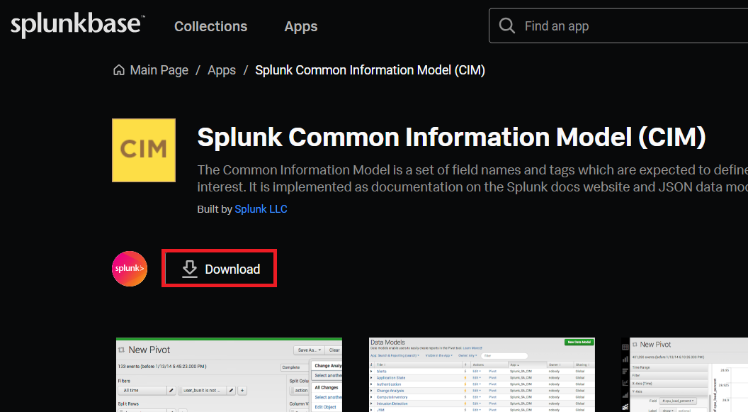 (2) 「Splunk Common Information Model (CIM)」の画面にて「Download」をクリックする。