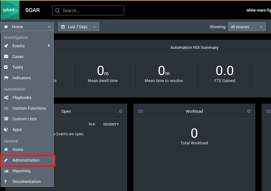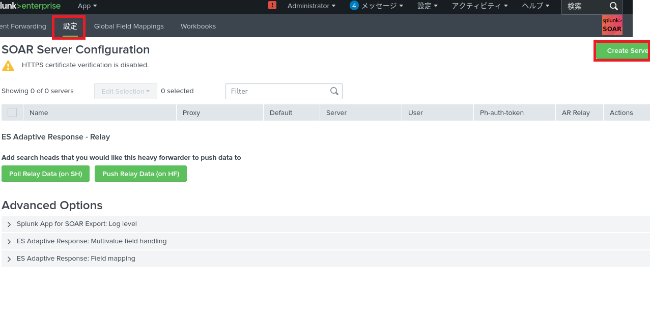 (1) ブラウザを用いてSplunk SOARの管理画面(http://[Splunk SOARのIPアドレス]:8443/)にログインし、メニュー欄から「Administrator」をクリックする。
