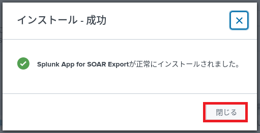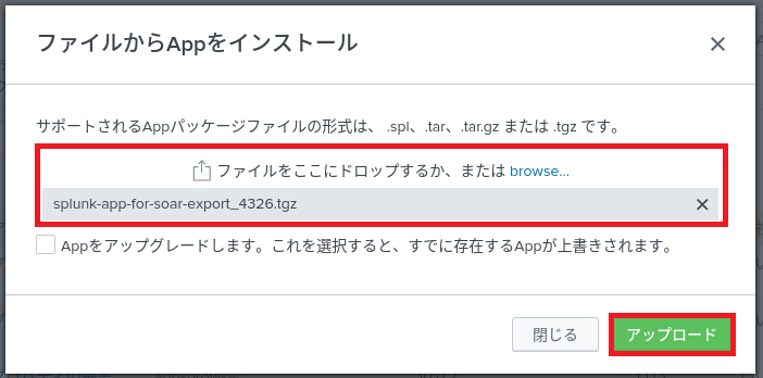 (4) 「Splunk App for SOAR Export」のファイル(splunk-app-for-soar-export_4326.tgz)を選択し、「アップロード」をクリックする。