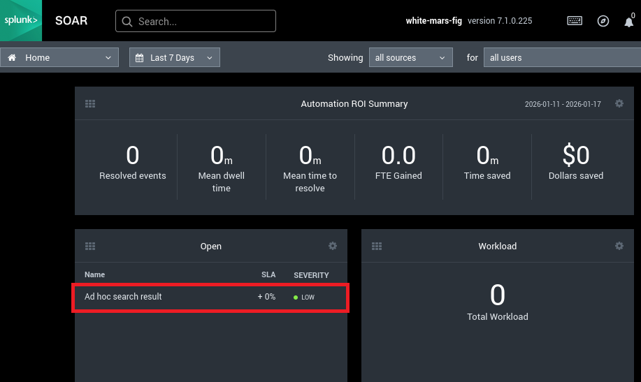 (13) ブラウザを用いてSplunk SOARの管理画面(http://[Splunk SOARのIPアドレス]:8443/)にログインし、ダッシュボード画面の「Ad hoc search result」をクリックする。