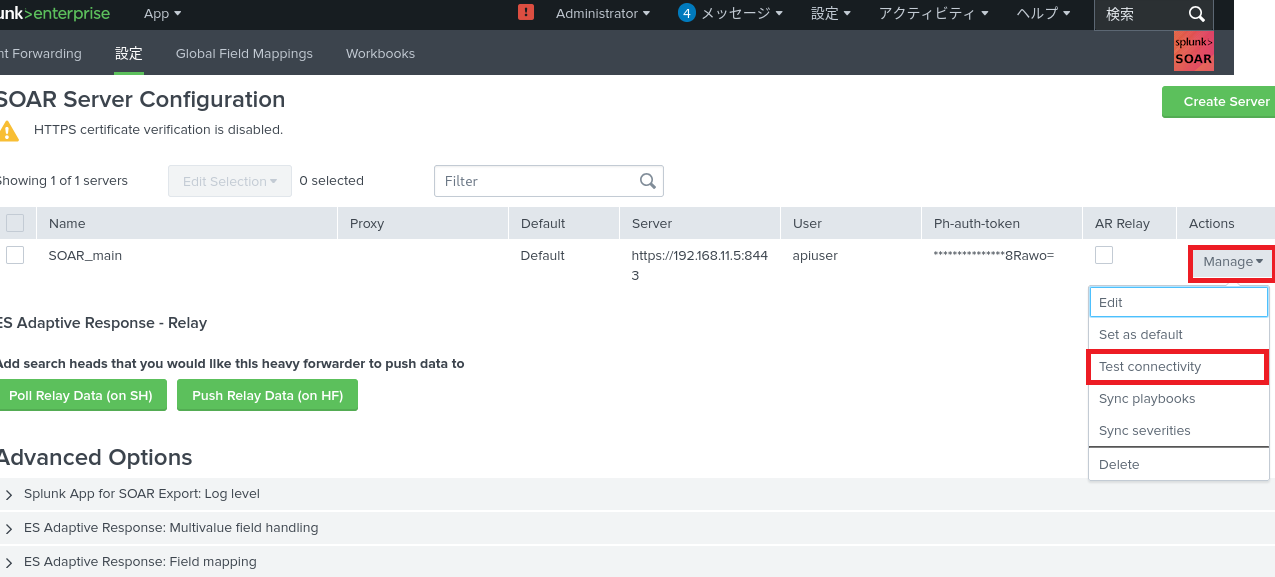 Splunk EnterpriseとSplunk SOARの接続テスト
