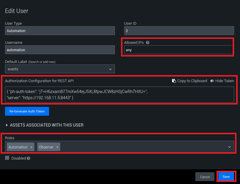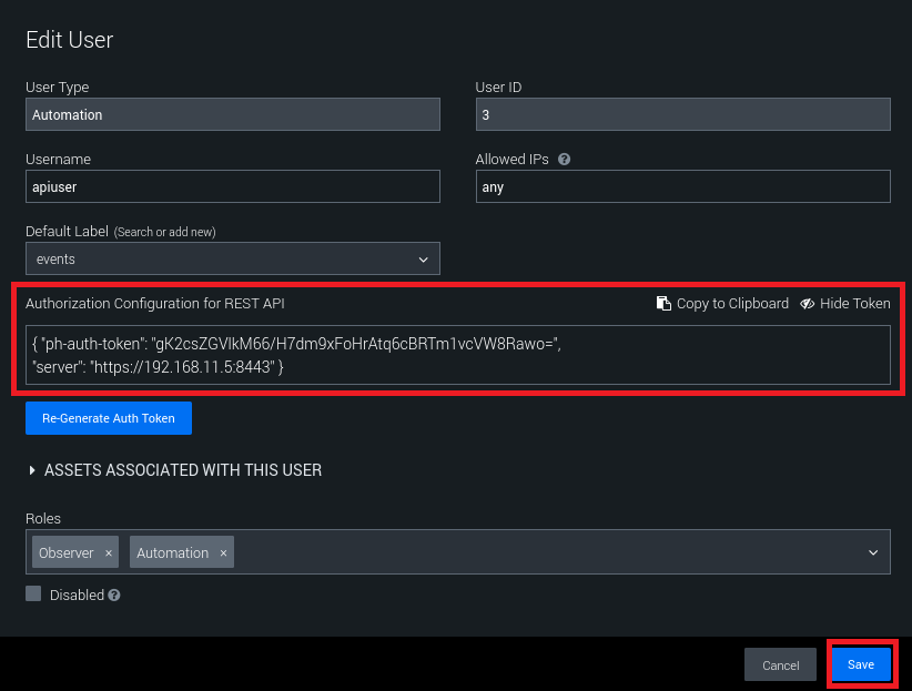 (5) 「Authorization Configuration for REST API」の文字列をコピーする。Splunk Enterpriseの「Splunk App for SOAR Export」に文字列を張り付けるため、メモ帳などに保存してください。その後、以下の内容を設定し「Save」をクリックする。