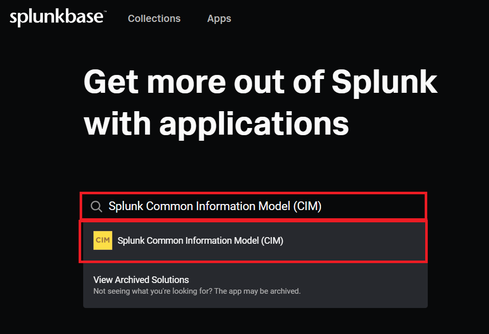 (1) ブラウザを用いて「https://splunkbase.splunk.com/」にアクセスして、「Splunk Common Information Model (CIM)」を検索する。