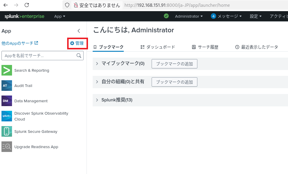 (5) ブラウザを用いてSplunk Enterpriseの管理画面(http://[Splunk EnterpriseのIPアドレス]:8000/)にログインし、App画面の「管理」をクリックする。
