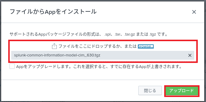 (7) 「Splunk Common Information Model (CIM)」のファイル(splunk-common-information-model-cim_630.tgz)を選択し、「アップロード」をクリックする。