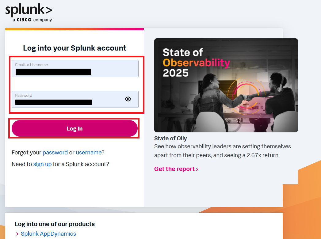 (1) ブラウザを用いて「https://login.splunk.com/」にアクセスして、ユーザー名とパスワードを入力してログインする。
