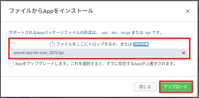 (7) 「Splunk App for SOAR」のファイル(splunk-app-for-soar_1072.tgz)を選択し、「アップロード」をクリックする。