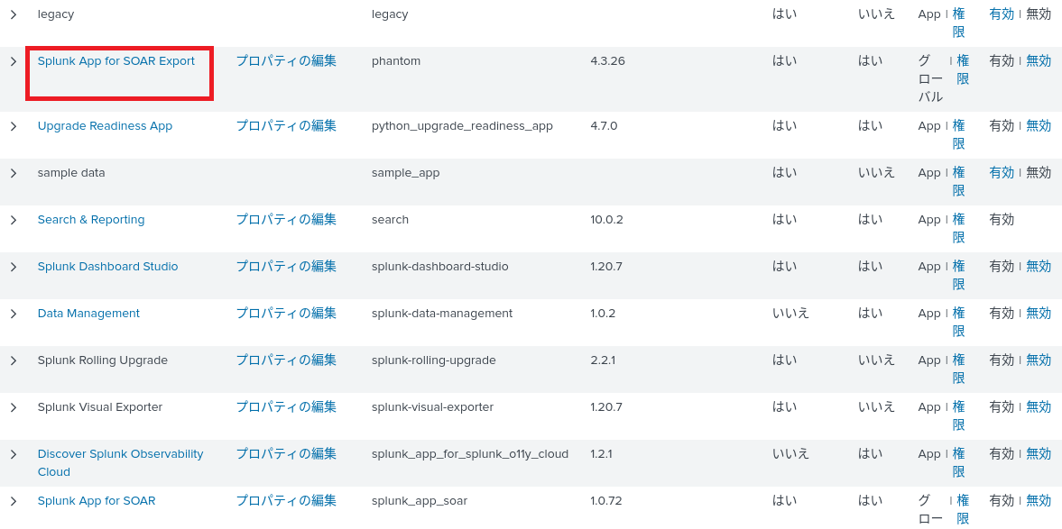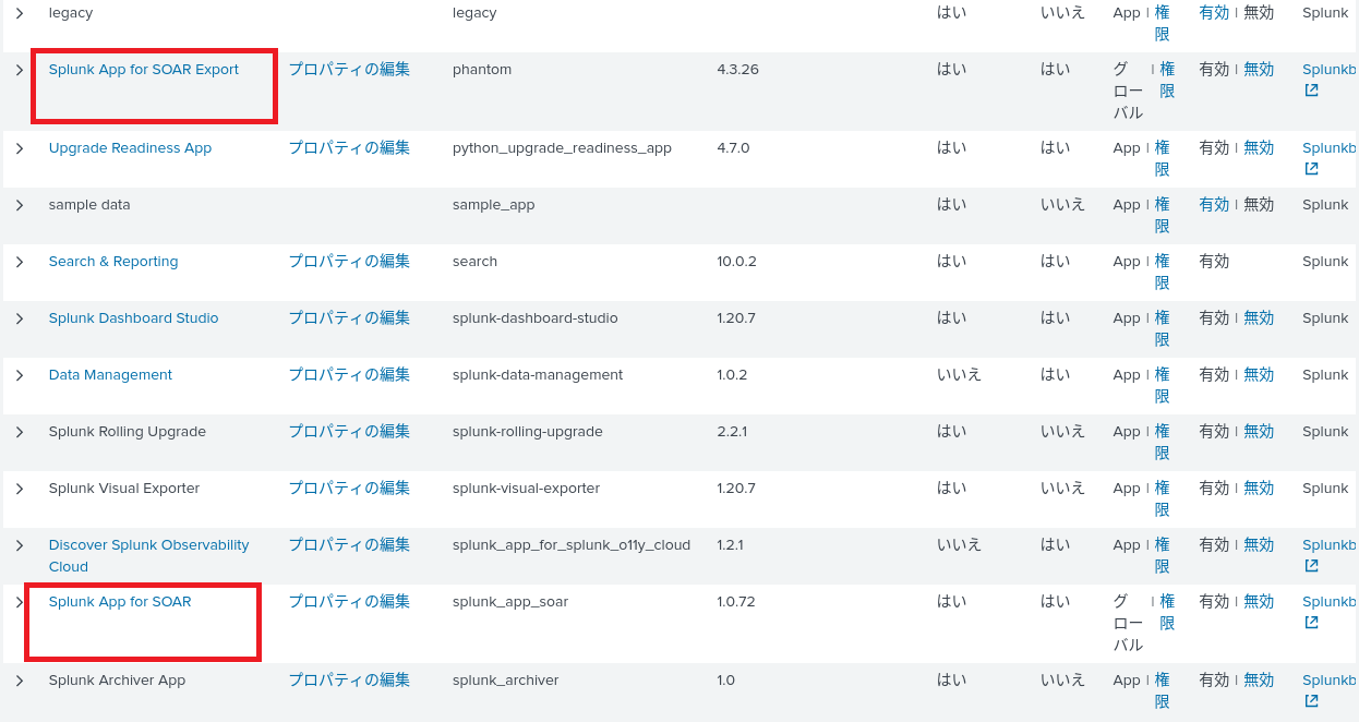 (9) Splunk EnterpriseのApp一覧に「Splunk App for SOAR Export」と「Splunk App for SOAR」があることを確認する。