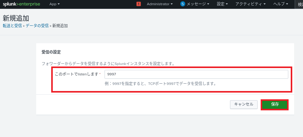 (3) 受信ポート(デフォルト値は「9997」)を入力して、「保存」をクリックする。