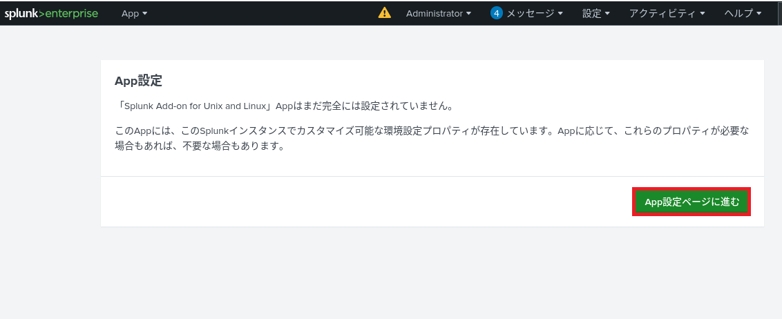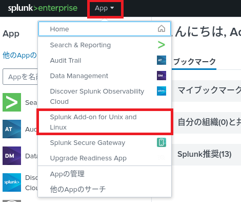 (1) [App] > [Splunk Add-on for Unix and Linux]をクリックする。